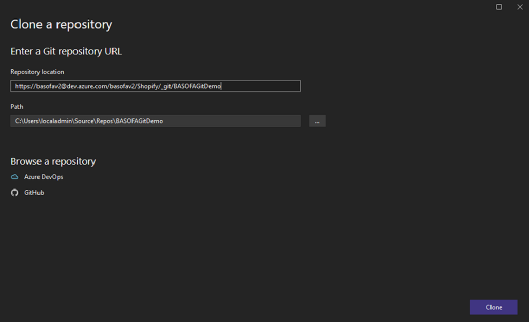 In Visual Studio, go to File → Clone Repository, paste the URL, choose your local path, and click Clone. This will create a local working copy of the repository, which you can now see in Solution Explorer.